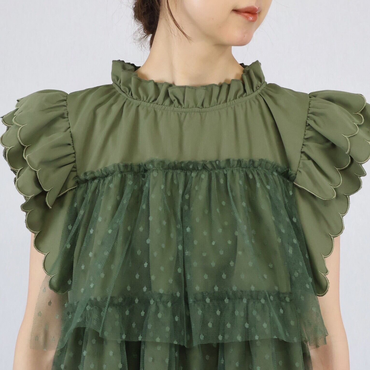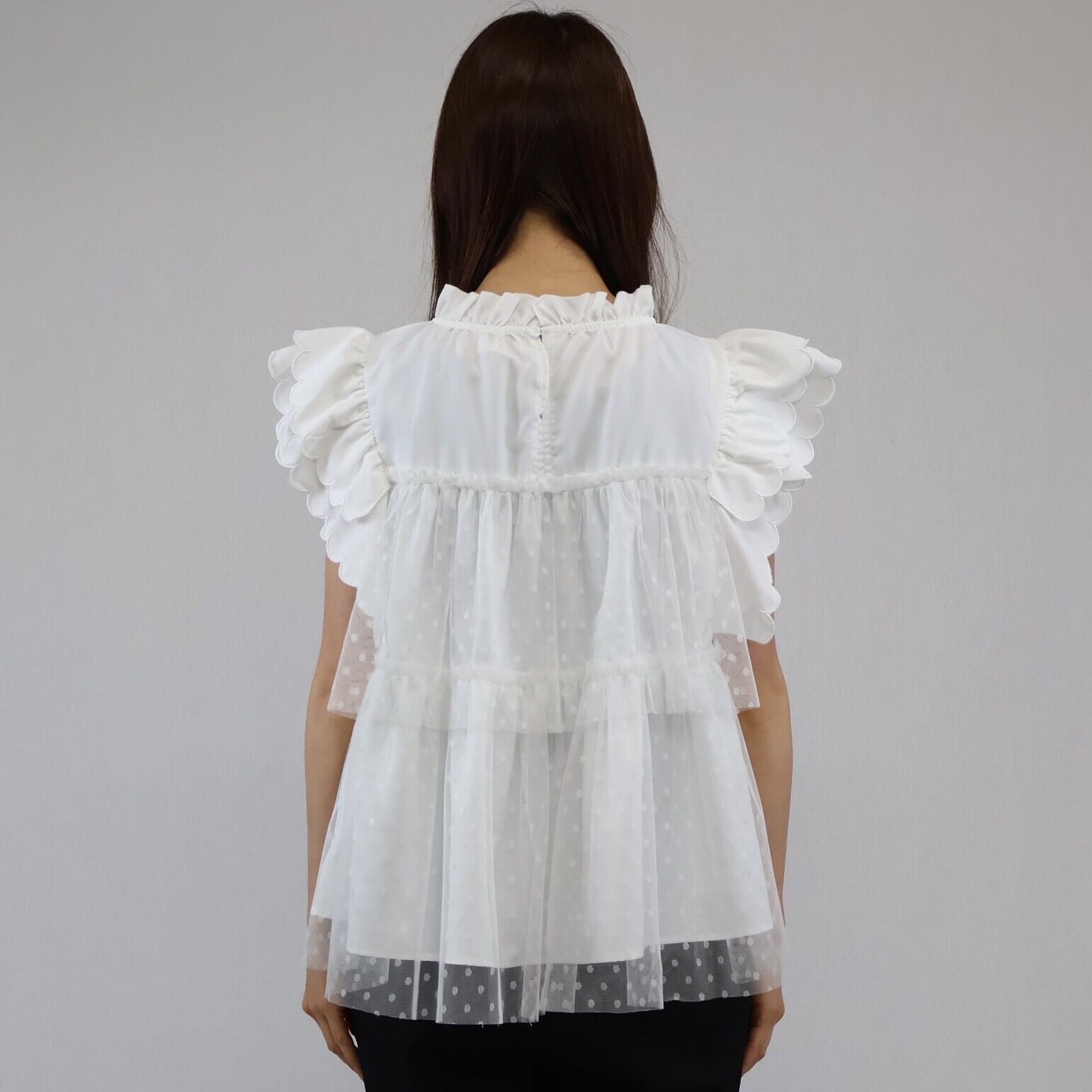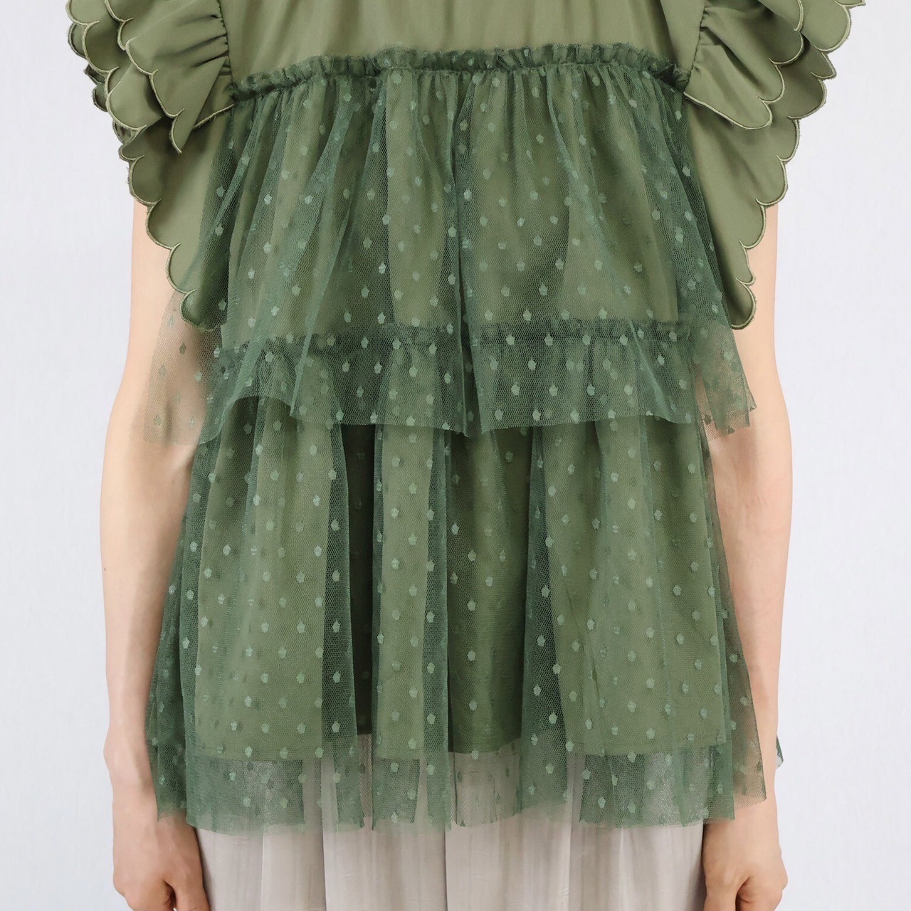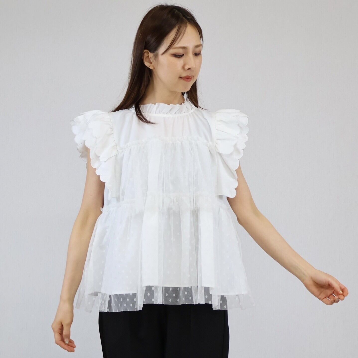 【2024年 新作】スカラップ ドット柄チュール かさねデザイン プルオーバー  ミセス 即納