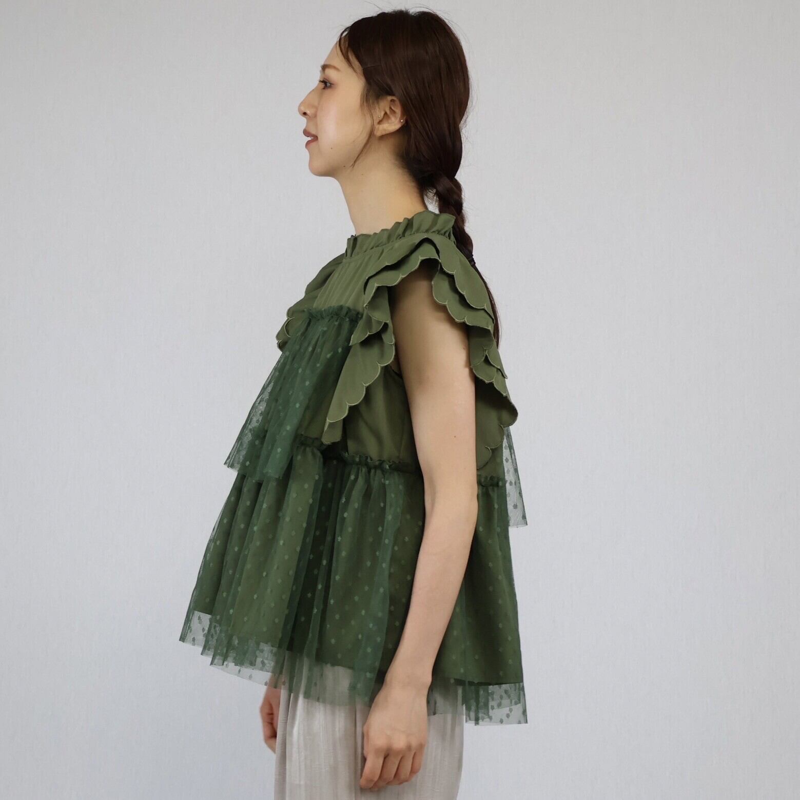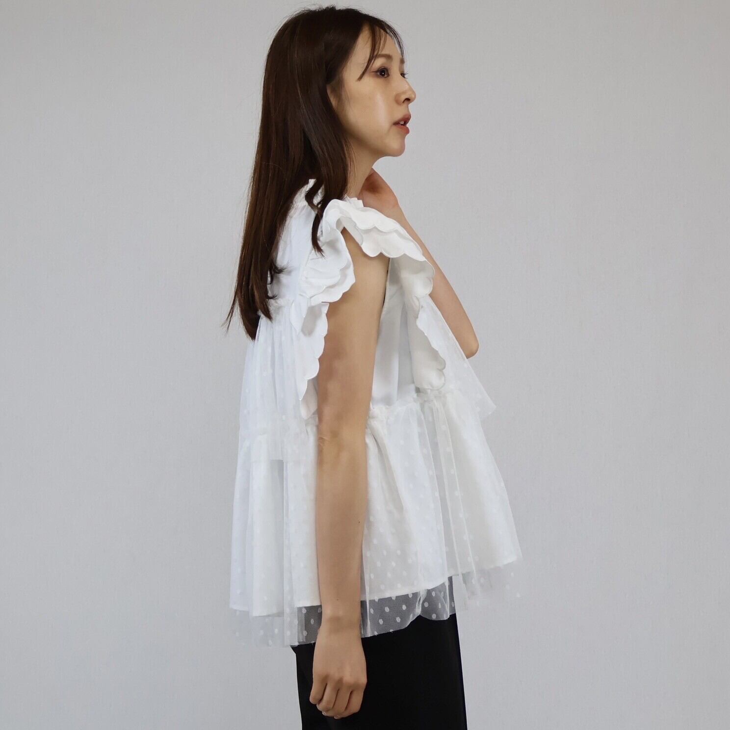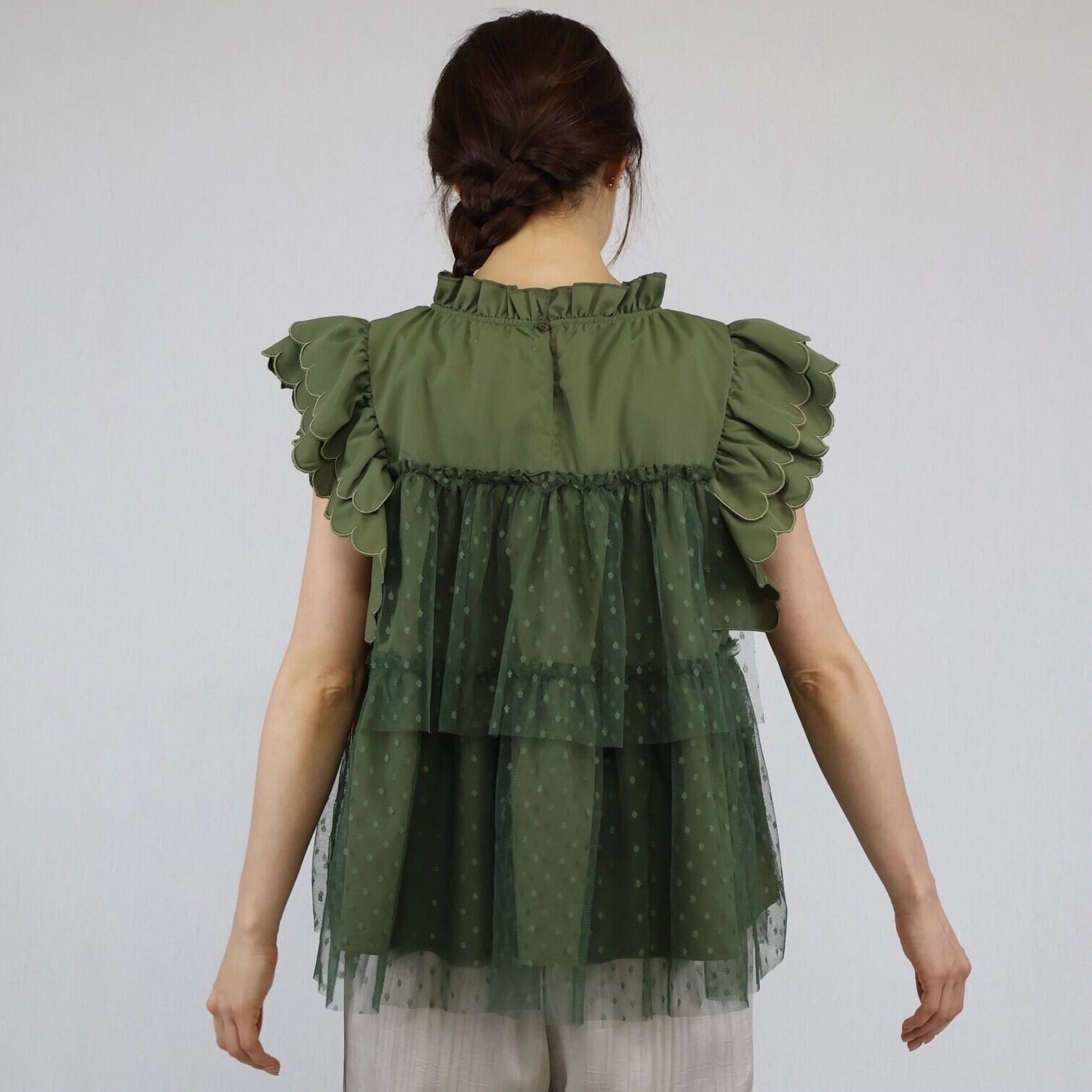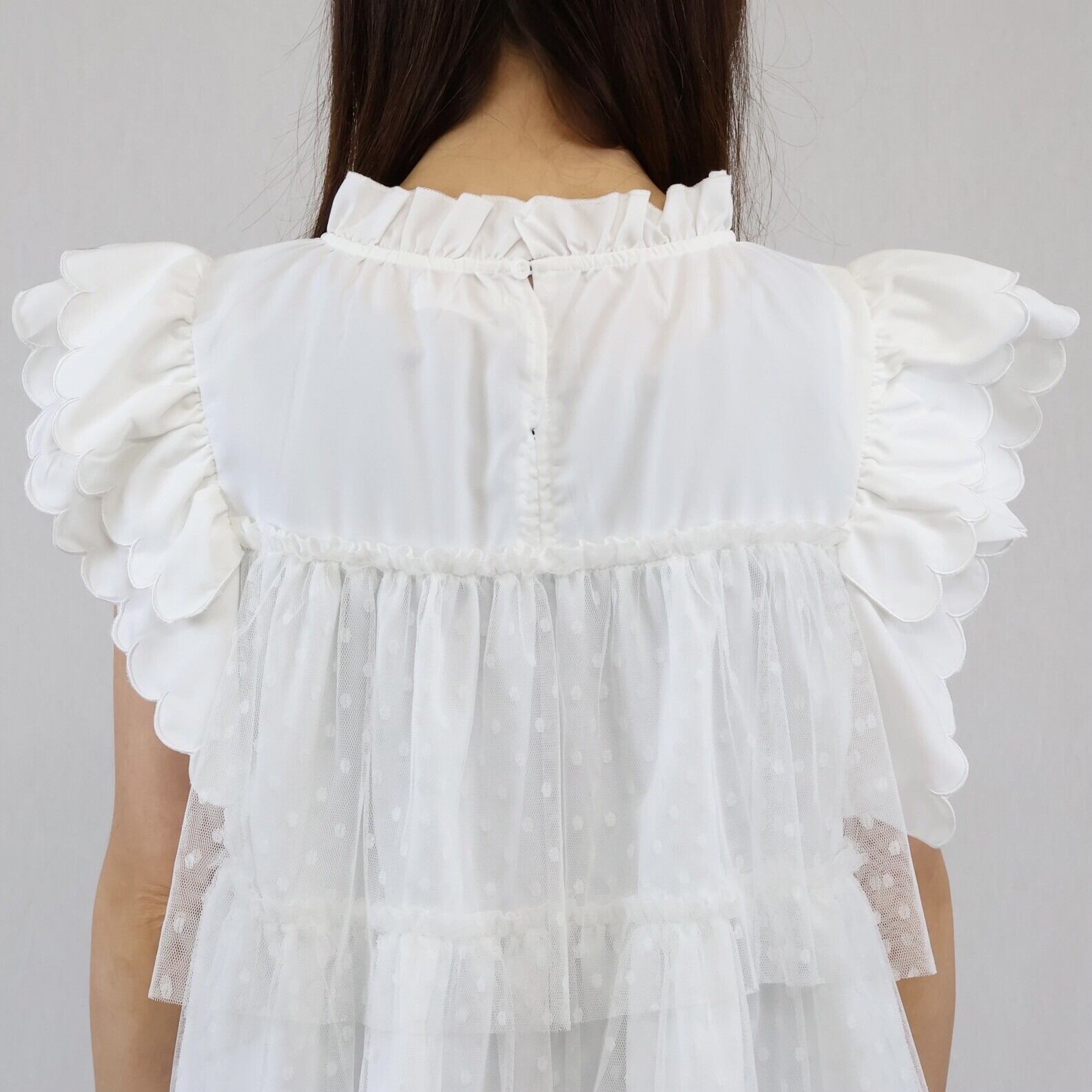 【2024年 新作】スカラップ ドット柄チュール かさねデザイン プルオーバー  ミセス 即納